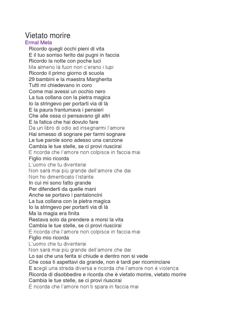 Ermal meta ha rilasciato diverse interviste in cui ha voluto spiegare il significato del testo di questo inedito: Number of times this content has been viewed 3 button to like this content button to share content button to report this content. Il successo di ermal meta dopo il secondo posto a sanremo con il brano vietato morire. Vietato morire è la nuova avventura di ermal meta; Oggi l'album omonimo è disco d'oro.